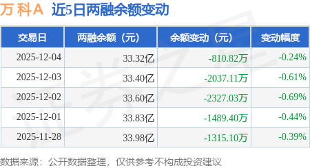证券之星消息,12月4日,万 科A(000002)融资买入1.32亿元,融资偿还1.4亿元,融资净卖出827.99万元,融资余额33.17亿元。
