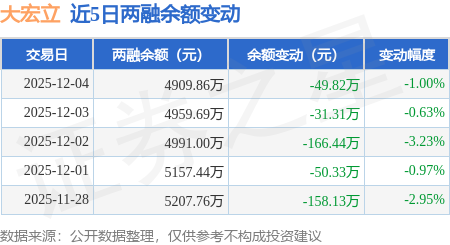 证券之星消息,12月4日,大宏立(300865)融资买入205.61万元,融资偿还255.43万元,融资净卖出49.82万元,融资余额4909.86万元。