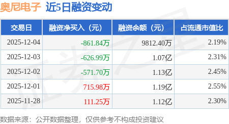 证券之星消息,12月4日,奥尼电子(301189)融资买入577.96万元,融资偿还1439.8万元,融资净卖出861.84万元,融资余额9812.4万元。