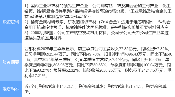 该股为航天,有色 · 锆,钍基熔盐堆概念热股,当日航天概念上涨4.12%,有色 · 锆概念上涨3.31%,钍基熔盐堆概念上涨3.0%。