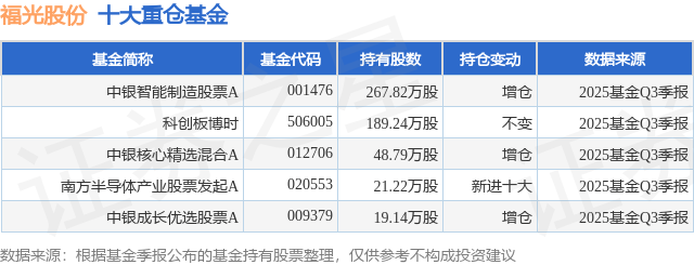 根据2025基金Q3季报公募基金重仓股数据,重仓该股的公募基金共5家,其中持有数量最多的公募基金为中银基金的中银智能制造股票A。中银智能制造股票A目前规模为12.03亿元,最新净值2.432(12月4日),较上一交易日上涨1.21%,近一年上涨38.1%。该公募基金现任基金经理为周斌。周斌在任的基金产品包括:中银成长优选股票A,管理时间为2022年3月30日至今,期间收益率为10.18%;中银核心精选混合A,管理时间为2023年12月4日至今,期间收益率为32.66%;
