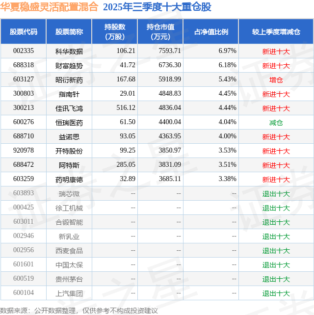 华夏稳盛灵活配置混合的前十大重仓股如下: