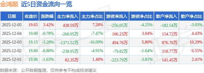 证券之星消息,截至2025年12月5日收盘,金鸿顺(603922)报收于19.65元,上涨3.42%,换手率1.74%,成交量3.12万手,成交额6022.41万元。