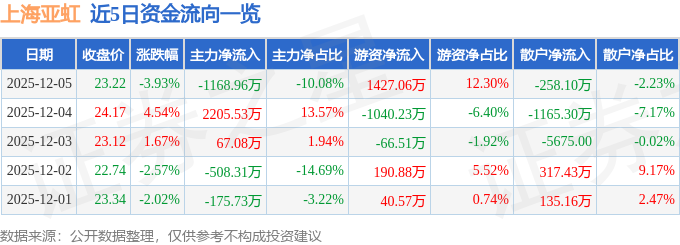 证券之星消息,截至2025年12月5日收盘,上海亚虹(603159)报收于23.22元,下跌3.93%,换手率3.61%,成交量5.06万手,成交额1.16亿元。