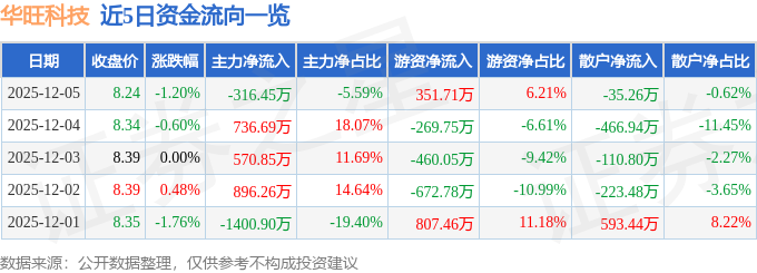证券之星消息,截至2025年12月5日收盘,华旺科技(605377)报收于8.24元,下跌1.2%,换手率1.24%,成交量6.89万手,成交额5662.2万元。
