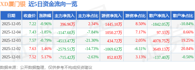 证券之星消息,截至2025年12月5日收盘,XD厦门银(601187)报收于7.22元,下跌0.96%,换手率0.9%,成交量23.66万手,成交额1.7亿元。
