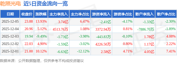 证券之星消息,截至2025年12月5日收盘,乾照光电(300102)报收于23.88元,上涨13.93%,换手率27.6%,成交量252.89万手,成交额57.82亿元。