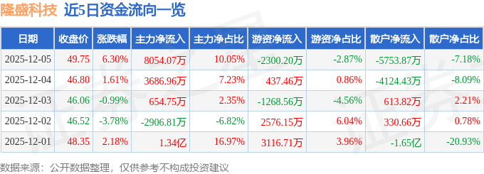 证券之星消息,截至2025年12月5日收盘,隆盛科技(300680)报收于49.75元,上涨6.3%,换手率9.36%,成交量16.46万手,成交额8.01亿元。