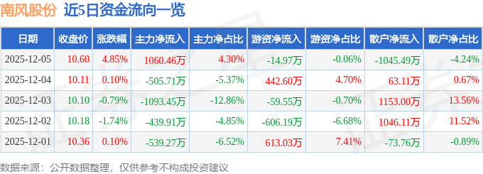 证券之星消息,截至2025年12月5日收盘,南风股份(300004)报收于10.6元,上涨4.85%,换手率4.95%,成交量23.77万手,成交额2.47亿元。