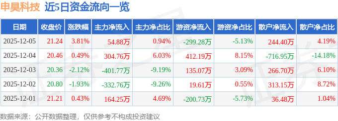 12月5日的资金流向数据方面,主力资金净流入54.88万元,占总成交额0.94%,游资资金净流出299.28万元,占总成交额5.13%,散户资金净流入244.4万元,占总成交额4.19%。