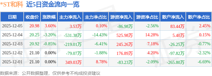 证券之星消息,截至2025年12月5日收盘,*ST和科(002816)报收于20.98元,上涨3.6%,换手率1.65%,成交量1.65万手,成交额3401.18万元。