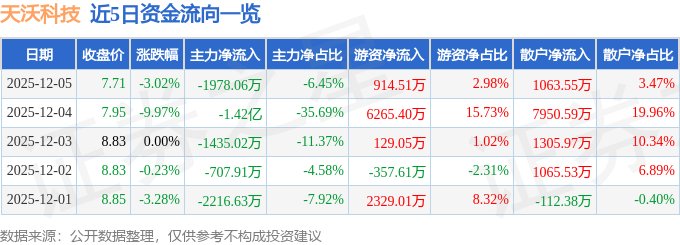 证券之星消息,截至2025年12月5日收盘,天沃科技(002564)报收于7.71元,下跌3.02%,换手率4.73%,成交量40.62万手,成交额3.06亿元。