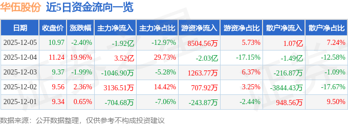 证券之星消息,截至2025年12月5日收盘,华伍股份(300095)报收于10.97元,下跌2.4%,换手率39.34%,成交量133.27万手,成交额14.83亿元。