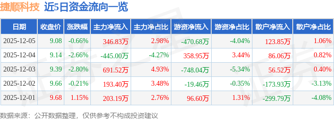 证券之星消息,截至2025年12月5日收盘,捷顺科技(002609)报收于9.08元,下跌0.66%,换手率2.79%,成交量12.84万手,成交额1.16亿元。