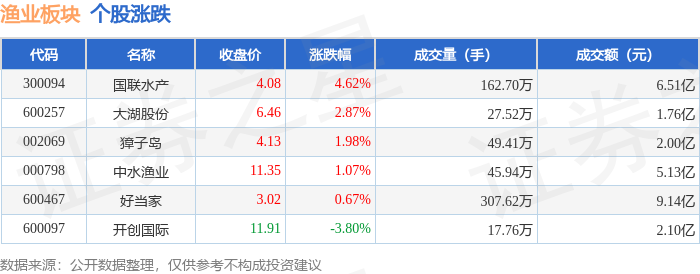 证券之星消息,12月5日渔业板块较上一交易日下跌0.67%,开创国际领跌。当日上证指数报收于3902.81,上涨0.7%。深证成指报收于13147.68,上涨1.08%。渔业板块个股涨跌见下表: