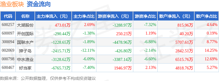 从资金流向上来看,当日渔业板块主力资金净流出1.34亿元,游资资金净流出7384.66万元,散户资金净流入2.07亿元。渔业板块个股资金流向见下表: