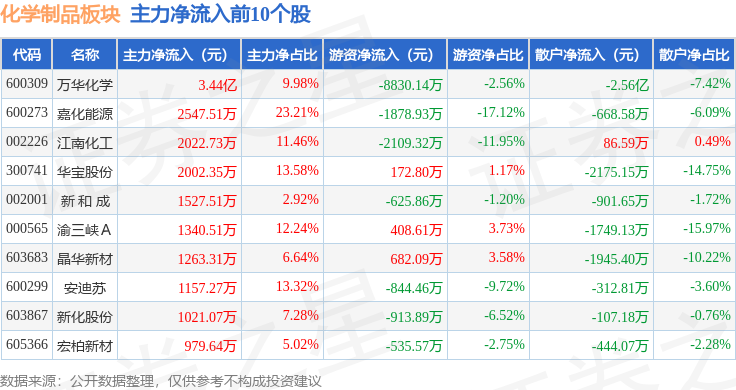 从资金流向上来看,当日化学制品板块主力资金净流出5.79亿元,游资资金净流出3.22亿元,散户资金净流入9.01亿元。化学制品板块个股资金流向见下表: