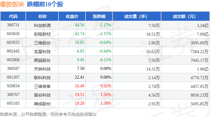 证券之星消息,12月5日橡胶板块较上一交易日下跌2.52%,科创新源领跌。当日上证指数报收于3902.81,上涨0.7%。深证成指报收于13147.68,上涨1.08%。橡胶板块个股涨跌见下表: