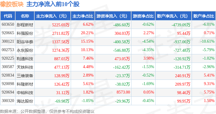 从资金流向上来看,当日橡胶板块主力资金净流出572.23万元,游资资金净流入1498.44万元,散户资金净流出926.2万元。橡胶板块个股资金流向见下表: