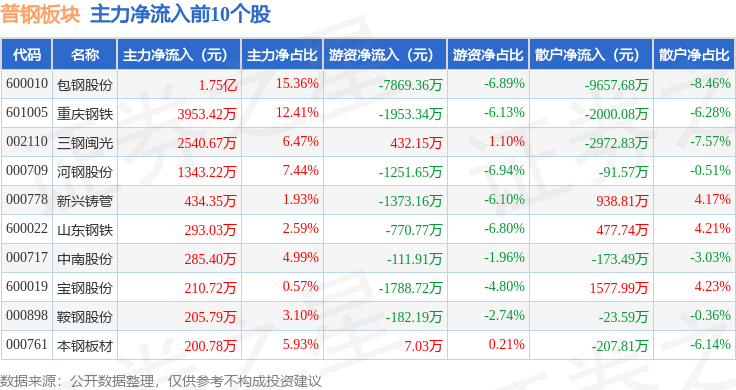 从资金流向上来看,当日普钢板块主力资金净流入1.27亿元,游资资金净流出1.7亿元,散户资金净流入4312.76万元。普钢板块个股资金流向见下表: