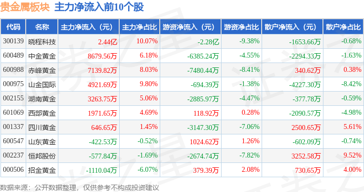 从资金流向上来看,当日贵金属板块主力资金净流入4.64亿元,游资资金净流出4.35亿元,散户资金净流出2884.31万元。贵金属板块个股资金流向见下表: