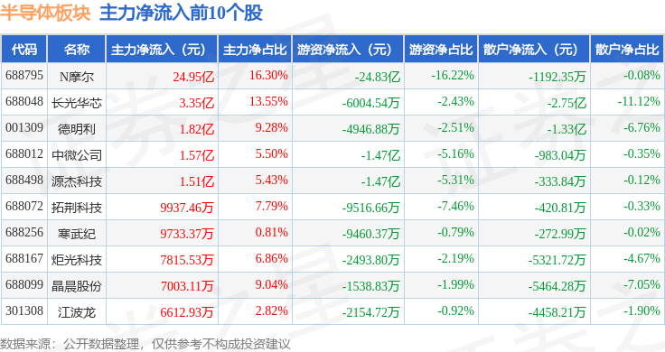 从资金流向上来看,当日半导体板块主力资金净流入10.57亿元,游资资金净流出20.38亿元,散户资金净流入9.81亿元。半导体板块个股资金流向见下表: