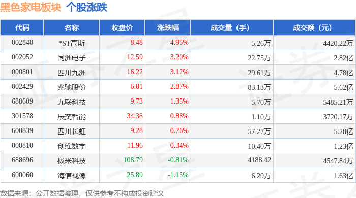 证券之星消息,12月5日黑色家电板块较上一交易日下跌0.63%,海信视像领跌。当日上证指数报收于3902.81,上涨0.7%。深证成指报收于13147.68,上涨1.08%。黑色家电板块个股涨跌见下表: