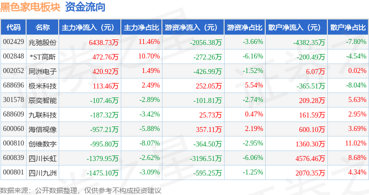 从资金流向上来看,当日黑色家电板块主力资金净流入2343.03万元,游资资金净流出6378.82万元,散户资金净流入4035.8万元。黑色家电板块个股资金流向见下表: