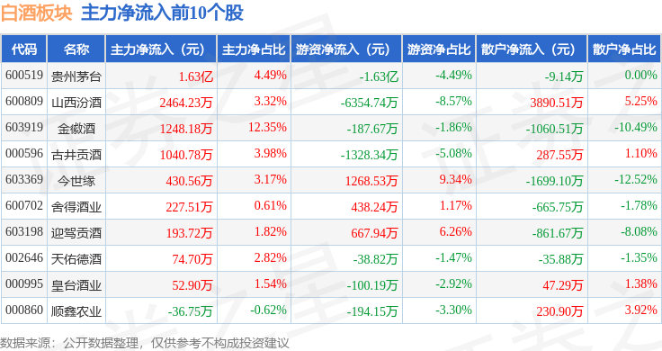 从资金流向上来看,当日白酒板块主力资金净流入259.12万元,游资资金净流出1.77亿元,散户资金净流入1.75亿元。白酒板块个股资金流向见下表: