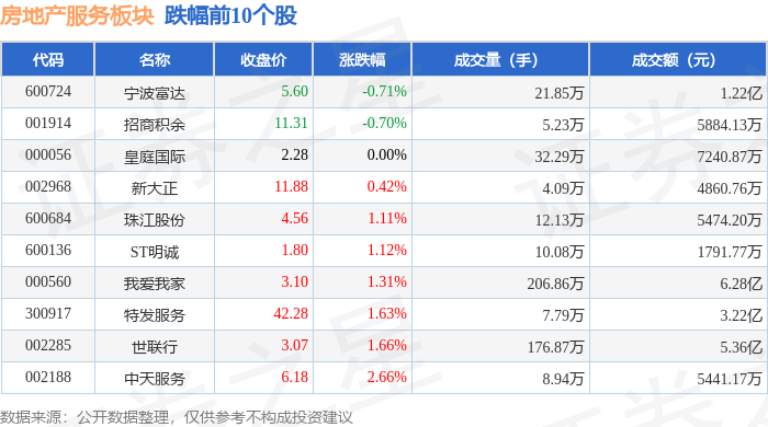 证券之星消息,12月5日房地产服务板块较上一交易日下跌2.08%,宁波富达领跌。当日上证指数报收于3902.81,上涨0.7%。深证成指报收于13147.68,上涨1.08%。房地产服务板块个股涨跌见下表: