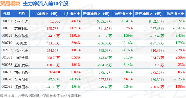 从资金流向上来看,当日贸易板块主力资金净流入1.65亿元,游资资金净流出8294.84万元,散户资金净流出8221.06万元。贸易板块个股资金流向见下表: