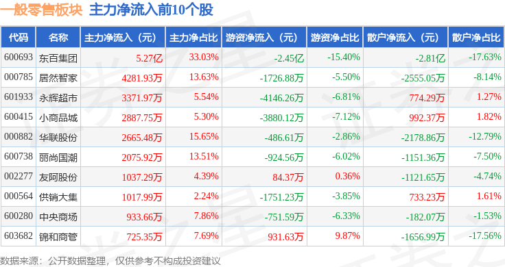从资金流向上来看,当日一般零售板块主力资金净流入3.68亿元,游资资金净流出2.89亿元,散户资金净流出7829.29万元。一般零售板块个股资金流向见下表: