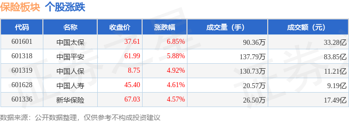 证券之星消息,12月5日保险板块较上一交易日上涨4.37%,中国太保领涨。当日上证指数报收于3902.81,上涨0.7%。深证成指报收于13147.68,上涨1.08%。保险板块个股涨跌见下表: