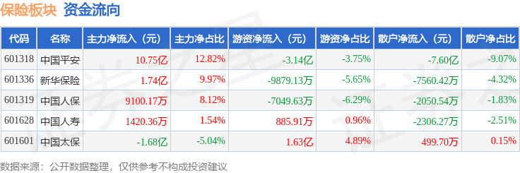 从资金流向上来看,当日保险板块主力资金净流入11.87亿元,游资资金净流出3.12亿元,散户资金净流出8.75亿元。保险板块个股资金流向见下表: