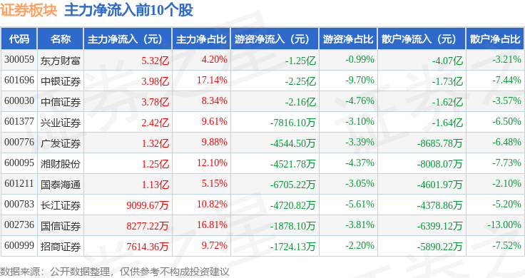 从资金流向上来看,当日证券板块主力资金净流入31.86亿元,游资资金净流出12.44亿元,散户资金净流出19.41亿元。证券板块个股资金流向见下表: