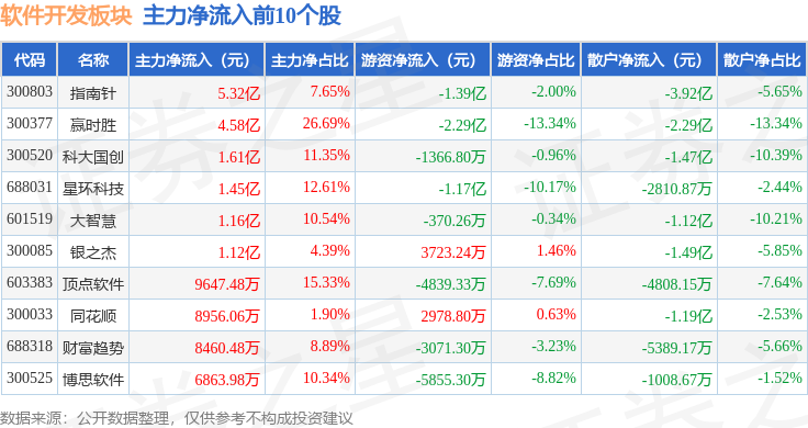 从资金流向上来看,当日软件开发板块主力资金净流入20.05亿元,游资资金净流出10.89亿元,散户资金净流出9.16亿元。软件开发板块个股资金流向见下表: