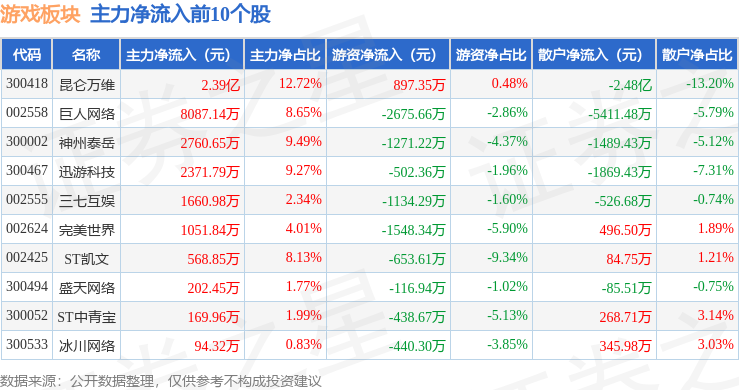 从资金流向上来看,当日游戏板块主力资金净流出3.29亿元,游资资金净流入3028.91万元,散户资金净流入2.99亿元。游戏板块个股资金流向见下表:
