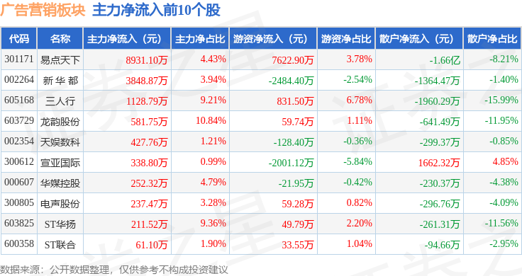 从资金流向上来看,当日广告营销板块主力资金净流出3.02亿元,游资资金净流出4537.99万元,散户资金净流入3.48亿元。广告营销板块个股资金流向见下表: