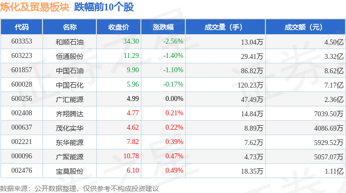 证券之星消息,12月5日炼化及贸易板块较上一交易日下跌0.64%,和顺石油领跌。当日上证指数报收于3902.81,上涨0.7%。深证成指报收于13147.68,上涨1.08%。炼化及贸易板块个股涨跌见下表: