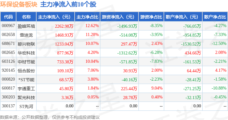 从资金流向上来看,当日环保设备板块主力资金净流出3593.01万元,游资资金净流出721.24万元,散户资金净流入4314.25万元。环保设备板块个股资金流向见下表: