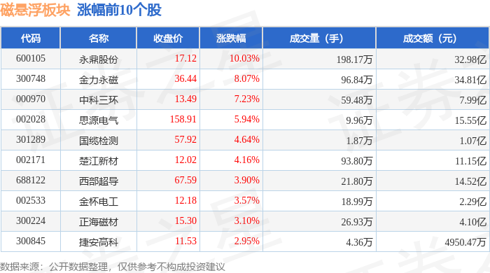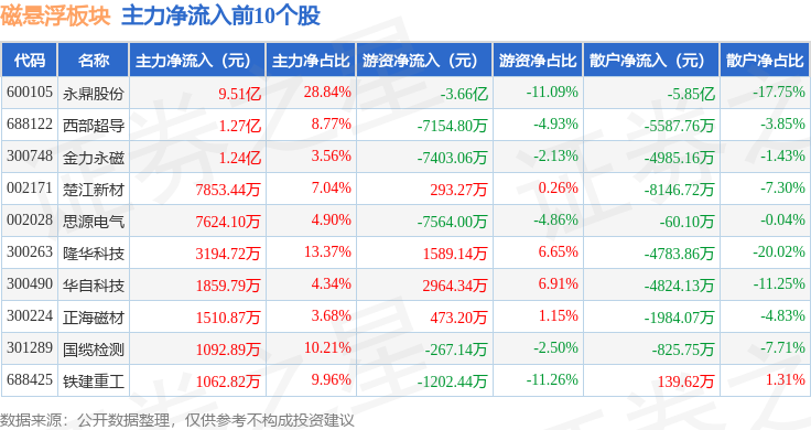 从资金流向上来看,当日磁悬浮板块主力资金净流入10.61亿元,游资资金净流出5.32亿元,散户资金净流出5.29亿元。磁悬浮板块个股资金流向见下表:
