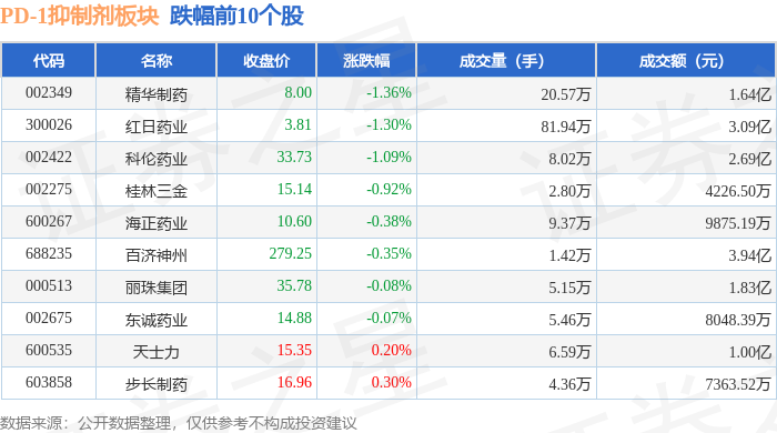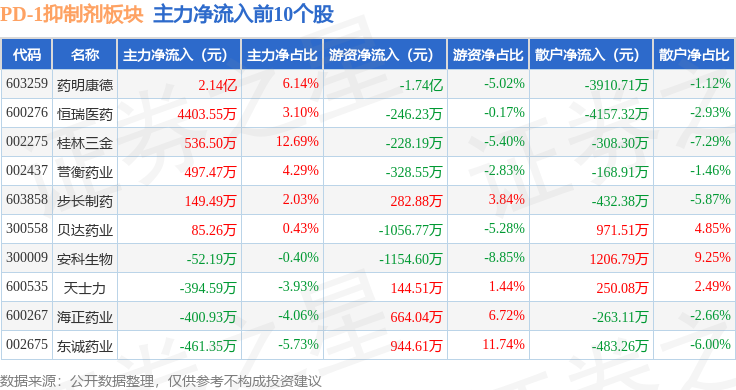 从资金流向上来看,当日PD-1抑制剂板块主力资金净流入1.29亿元,游资资金净流出1.83亿元,散户资金净流入5461.01万元。PD-1抑制剂板块个股资金流向见下表: