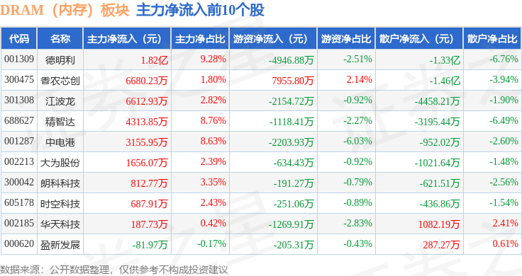 从资金流向上来看,当日DRAM(内存)板块主力资金净流出9.96亿元,游资资金净流入2.99亿元,散户资金净流入6.97亿元。DRAM(内存)板块个股资金流向见下表: