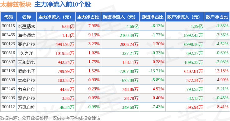 从资金流向上来看,当日太赫兹板块主力资金净流出7.31亿元,游资资金净流出1.27亿元,散户资金净流入8.58亿元。太赫兹板块个股资金流向见下表: