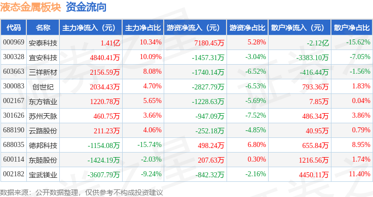 从资金流向上来看,当日液态金属板块主力资金净流入1.88亿元,游资资金净流出1409.15万元,散户资金净流出1.74亿元。液态金属板块个股资金流向见下表: