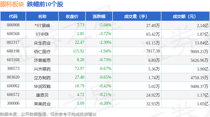 证券之星消息,12月5日眼科板块较上一交易日下跌0.15%,*ST景峰领跌。当日上证指数报收于3902.81,上涨0.7%。深证成指报收于13147.68,上涨1.08%。眼科板块个股涨跌见下表: