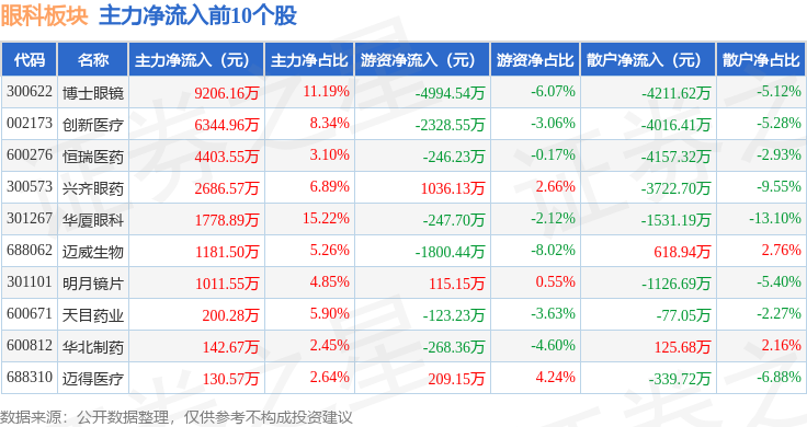 从资金流向上来看,当日眼科板块主力资金净流出2.9亿元,游资资金净流出183.15万元,散户资金净流入2.92亿元。眼科板块个股资金流向见下表:
