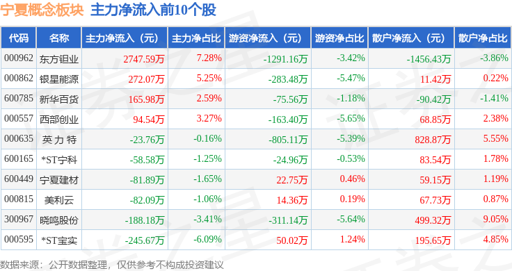 从资金流向上来看,当日宁夏概念板块主力资金净流出3911.19万元,游资资金净流出3411.8万元,散户资金净流入7322.99万元。宁夏概念板块个股资金流向见下表: