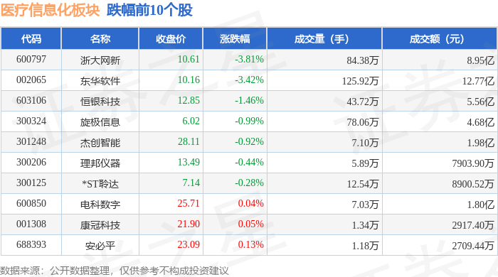 证券之星消息,12月5日医疗信息化板块较上一交易日下跌0.81%,浙大网新领跌。当日上证指数报收于3902.81,上涨0.7%。深证成指报收于13147.68,上涨1.08%。医疗信息化板块个股涨跌见下表: