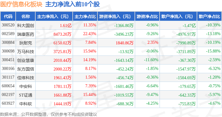 从资金流向上来看,当日医疗信息化板块主力资金净流出4.04亿元,游资资金净流出1773.51万元,散户资金净流入4.22亿元。医疗信息化板块个股资金流向见下表: